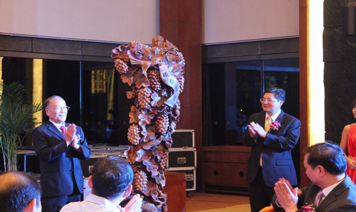 为庆贺南大光电成功上市,8月10日,苏州交通银行行长束兰根校友代表单位向南大光电赠送了工艺木雕“硕果累累”寓意南大光电取得了丰硕的成果,并祝愿南大光电,更上一层楼,取得更加丰硕的成果。(编辑/摄影 钱晓峰)