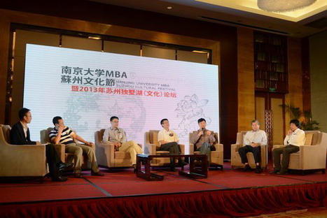 六月二日,文化节第二天,南京大学MBA独墅湖(文化)论坛在福朋喜来登酒店召开。论坛分为两部分,第一部分中,南京大学文学院院长徐兴无教授与来宾分享了“中国文化结构特征与精神”。上下几千年,纵横往复,徐院长对中国文化的结构和特征梳理,提供了新的视角,引人思索。苏州大学凤凰传媒学院副院长徐国源教授做了主题为“文化苏州”的演讲。三生花草梦苏州,一句诗似道尽千言,苏州气韵萦然其中,南大MBA在苏州的落地生根,发扬光大,似乎找到了历史和文化的呼应。茶歇过后,南京大学第13届MBA联合会苏州分会副主席侯军同学主持了圆桌对话:文化与创造力。南京大学文学院院长徐兴无教授、苏州大学凤凰传媒学院副院长徐国源教授、南京大学文学院副院长、戏剧影视艺术系主任吕效平教授、苏州新沧浪房产有限公司董事长史建华先生、苏州太湖窑文化有限公司董事长孙厚义先生、苏州青年旅行社股份有限公司总经理助理强巍先生参加了本次圆桌对话。《蒋公的面子》依然是圆桌对话的热点,作为该剧导演的吕效平院长这样评论:“南大的百年历史是《蒋公的面子》孕育、生存的土壤。” 吕院长还给我们带来了一个好消息:2013年11月20日,《蒋》剧将飞跃重洋,赴美国演出。这是南大的骄傲,是南大人的骄傲。除此之外,参与圆桌对话的学界和商界精英们还对苏州古城保护和陶瓷艺术文化展开了讨论。此次论坛,是文化和商业的一次融合尝试,也预示着在苏州这块土地上,人文和商业必将密不可分,共生共荣。